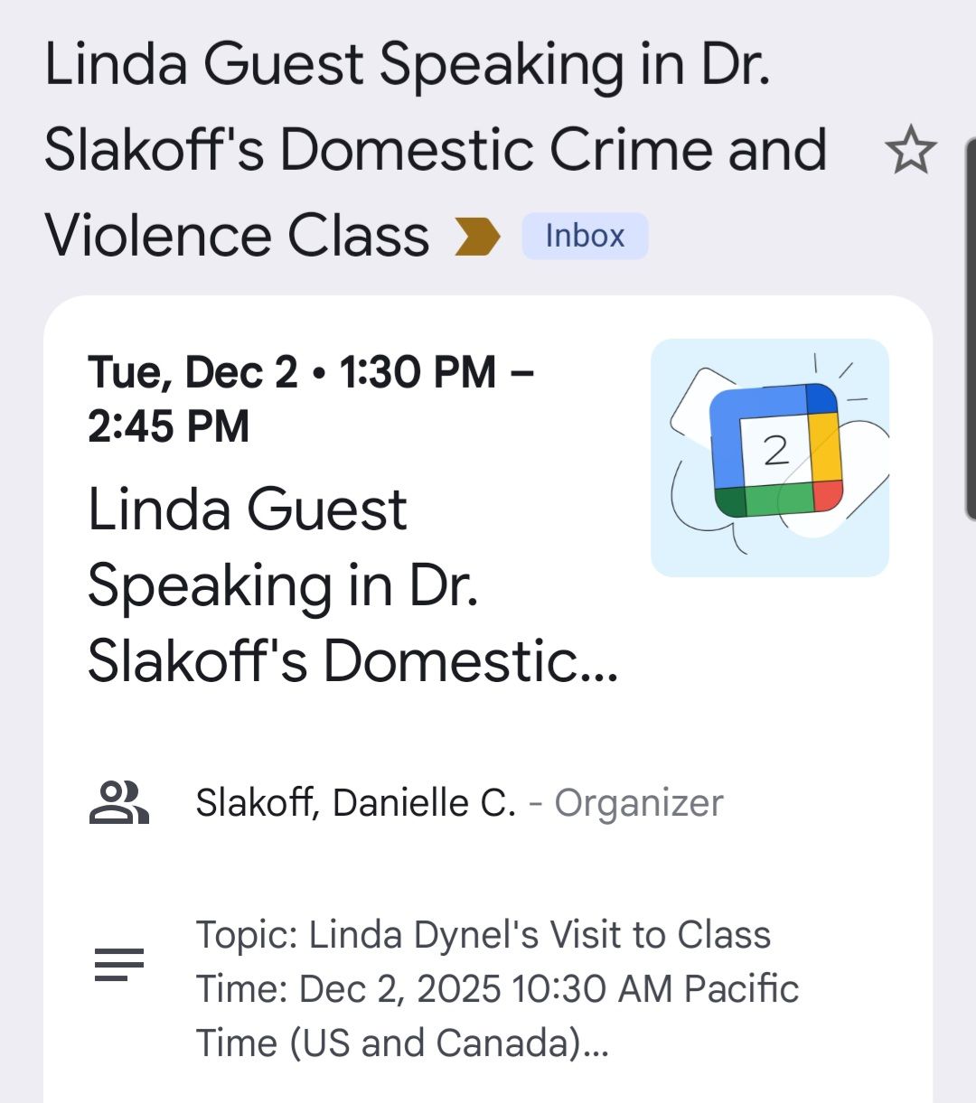December 3 – CalState University Sacramento, Dr. Danielle Slakoff Domestic Crime & Violence class