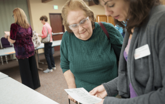 Participants were brought into a mixed-use room where I’d worked previously, only this time instead of rows of chairs there were long tables with stacks of colorful note cards. Each table had a sign attached: “Social Services”, “Hospital”, “Employment”, etc. Attendees were then paired up and we were told to pick a person’s name from the starter table. After that the journey begins; you are to make choices for your person while reading their perspective (as well as their batterer’s perspective) from each side of the card.